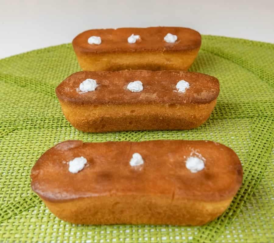 As formas que uso são as do tipo “forma retangular colombinho” com medidas de 9,5 x 5,5 x 3 cm. Ficam com o tamanho certinho dos bolinhos Ana Maria.